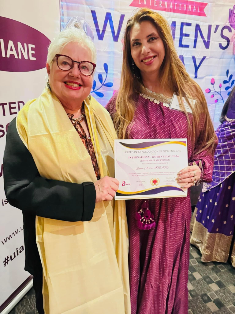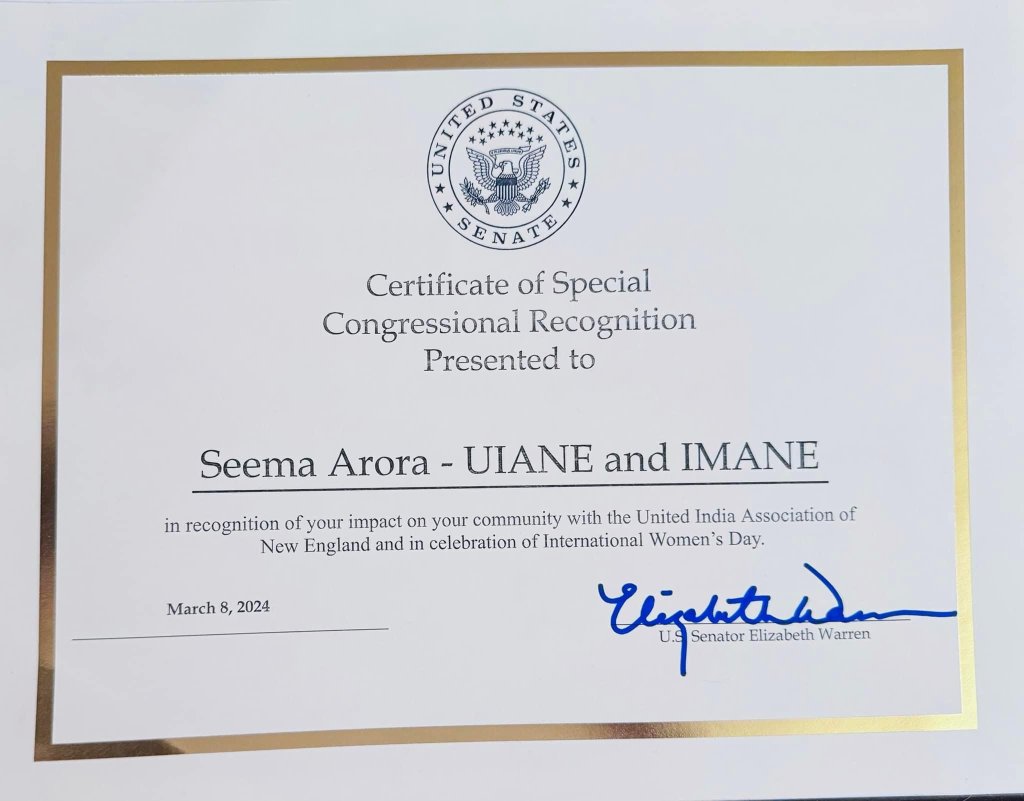 In recognition of her ongoing contributions to the community, Dr. Arora received Congressional Recognition on International Women’s Day in March 2024 from Elizabeth Warren, United States Senator from Massachusetts. The recognition was presented by Massachusetts State Representative Kay Khan, honoring Dr. Arora’s continued efforts in community health, education, and service initiatives in New England.